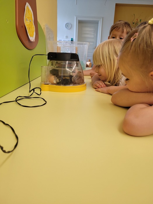 Všichni jsme si užili krásný týden s kuřátky. Z pěti vajíček se nám narodilo krásných pět kuřátek. Tři z nich černá a dvě žlutá. Byl to krásný zážitek nejen pro děti, ale i pro paní učitelky a rodiče.